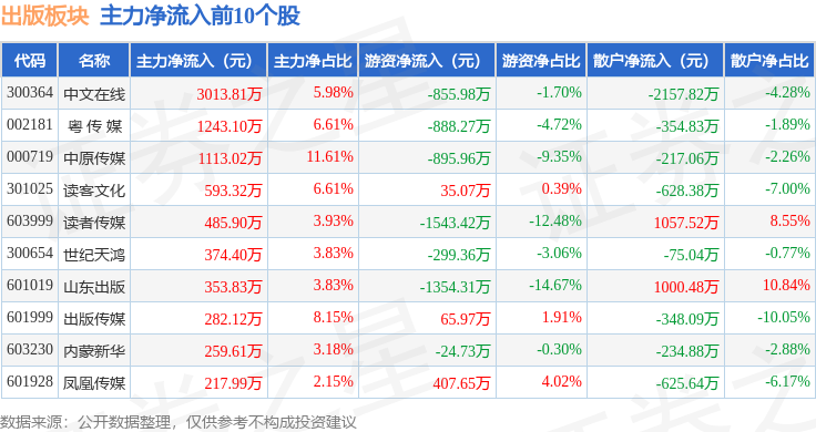 从资金流向上来看,当日出版板块主力资金净流出424.17万元,游资资金净流出3612.87万元,散户资金净流入4037.04万元。出版板块个股资金流向见下表:
