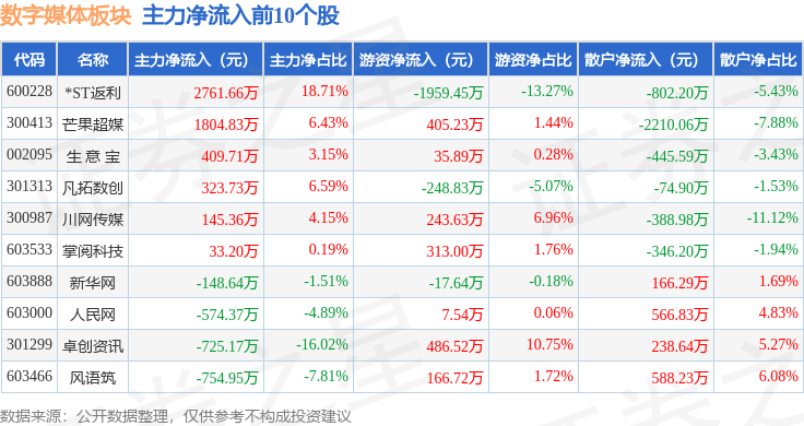 从资金流向上来看,当日数字媒体板块主力资金净流出3763.41万元,游资资金净流出2193.93万元,散户资金净流入5957.34万元。数字媒体板块个股资金流向见下表: