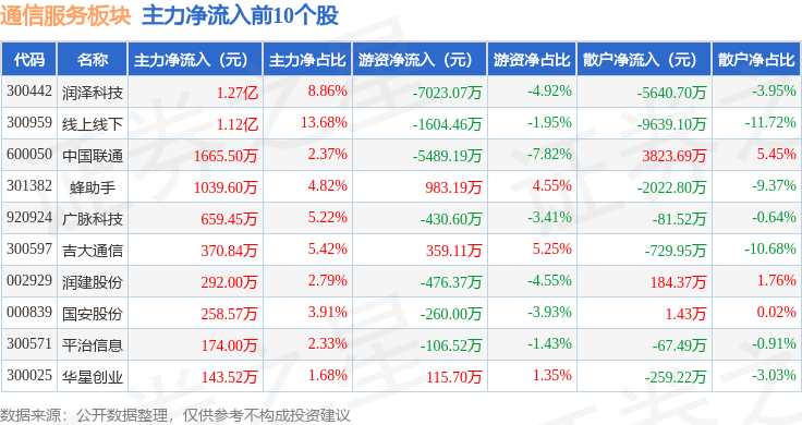 从资金流向上来看,当日通信服务板块主力资金净流出3.47亿元,游资资金净流出2107.29万元,散户资金净流入3.68亿元。通信服务板块个股资金流向见下表: