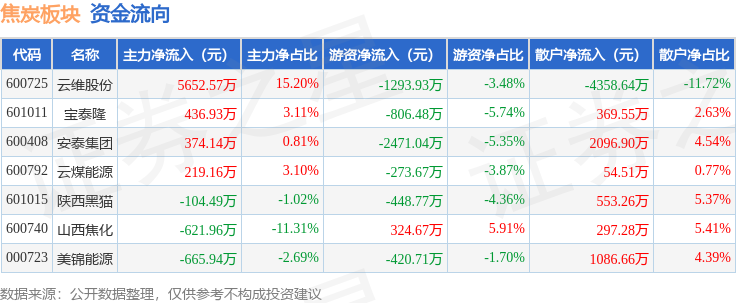从资金流向上来看,当日焦炭板块主力资金净流入5290.41万元,游资资金净流出5389.94万元,散户资金净流入99.53万元。焦炭板块个股资金流向见下表: