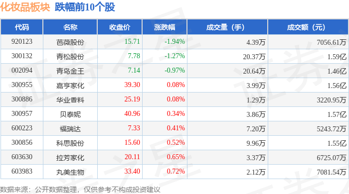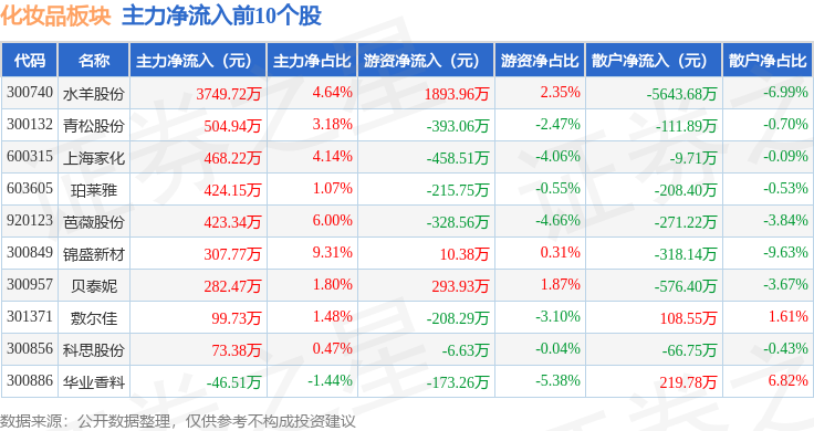 从资金流向上来看,当日化妆品板块主力资金净流入4203.95万元,游资资金净流出234.48万元,散户资金净流出3969.47万元。化妆品板块个股资金流向见下表:
