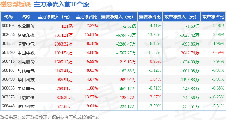 从资金流向上来看,当日磁悬浮板块主力资金净流入9876.03万元,游资资金净流出5.01亿元,散户资金净流入4.02亿元。磁悬浮板块个股资金流向见下表: