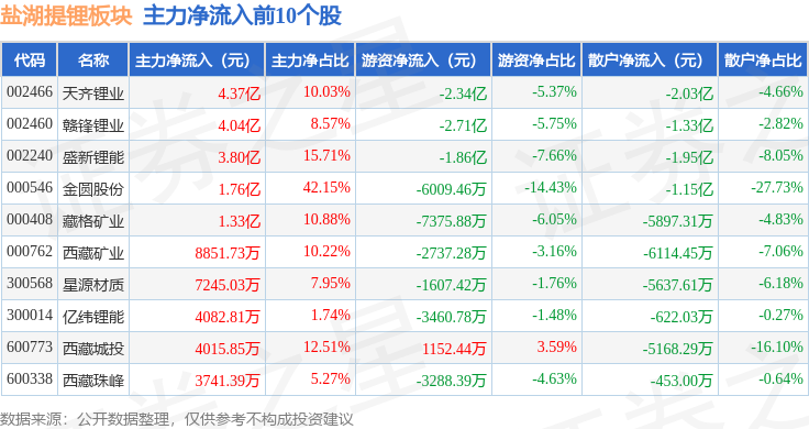 从资金流向上来看,当日盐湖提锂板块主力资金净流入16.39亿元,游资资金净流出11.36亿元,散户资金净流出5.03亿元。盐湖提锂板块个股资金流向见下表: