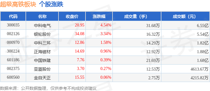 证券之星消息,12月17日超级高铁板块较上一交易日上涨1.3%,中科电气领涨。当日上证指数报收于3870.28,上涨1.19%。深证成指报收于13224.51,上涨2.4%。超级高铁板块个股涨跌见下表: