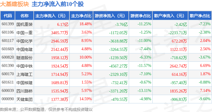 从资金流向上来看,当日大基建板块主力资金净流入1.7亿元,游资资金净流出7.37亿元,散户资金净流入5.67亿元。大基建板块个股资金流向见下表: