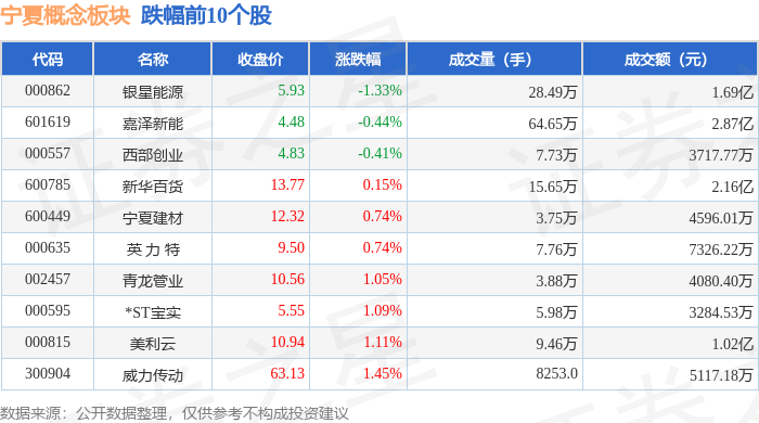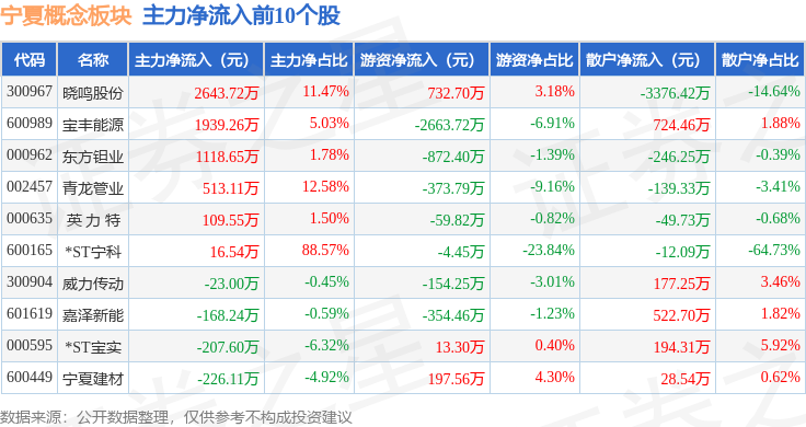 从资金流向上来看,当日宁夏概念板块主力资金净流入2027.27万元,游资资金净流出2724.5万元,散户资金净流入697.24万元。宁夏概念板块个股资金流向见下表: