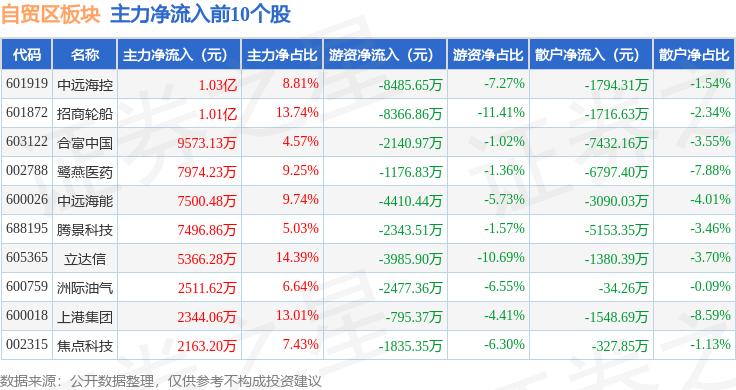 从资金流向上来看,当日自贸区板块主力资金净流出63.06亿元,游资资金净流出7.53亿元,散户资金净流入70.59亿元。自贸区板块个股资金流向见下表: