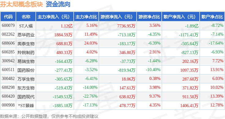 从资金流向上来看,当日芬太尼概念板块主力资金净流入9562.74万元,游资资金净流入7612.19万元,散户资金净流出1.72亿元。芬太尼概念板块个股资金流向见下表: