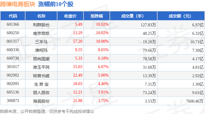 证券之星消息,12月17日跨境电商板块较上一交易日上涨0.76%,利群股份领涨。当日上证指数报收于3870.28,上涨1.19%。深证成指报收于13224.51,上涨2.4%。跨境电商板块个股涨跌见下表: