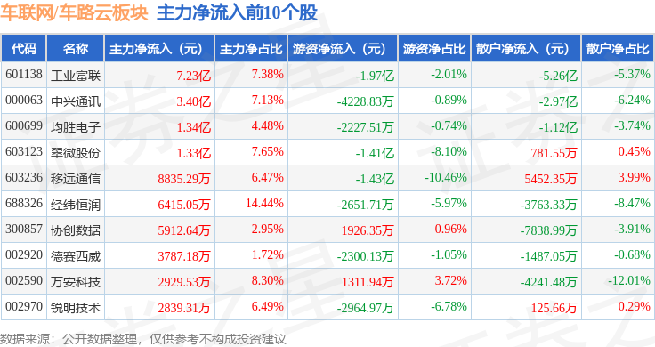 从资金流向上来看,当日车联网/车路云板块主力资金净流出26.43亿元,游资资金净流出3.56亿元,散户资金净流入30.0亿元。车联网/车路云板块个股资金流向见下表:
