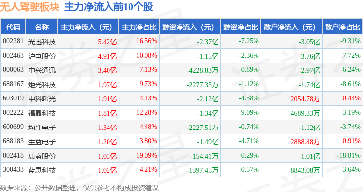 从资金流向上来看,当日无人驾驶板块主力资金净流出32.49亿元,游资资金净流出6.11亿元,散户资金净流入38.6亿元。无人驾驶板块个股资金流向见下表: