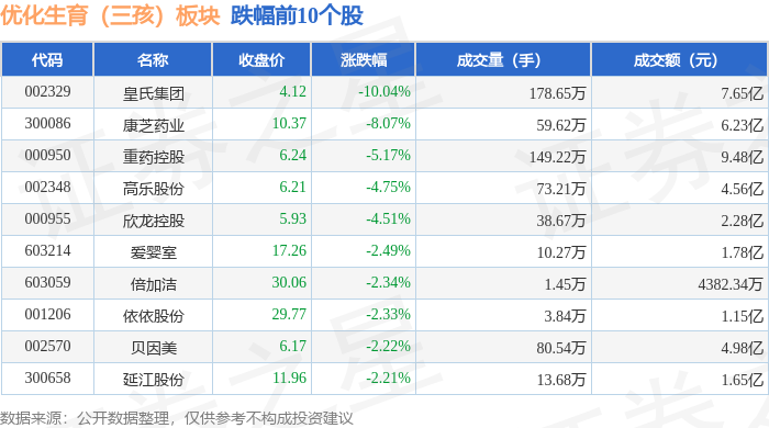 从资金流向上来看,当日优化生育(三孩)板块主力资金净流出7145.44万元,游资资金净流出586.71万元,散户资金净流入7732.15万元。优化生育(三孩)板块个股资金流向见下表: