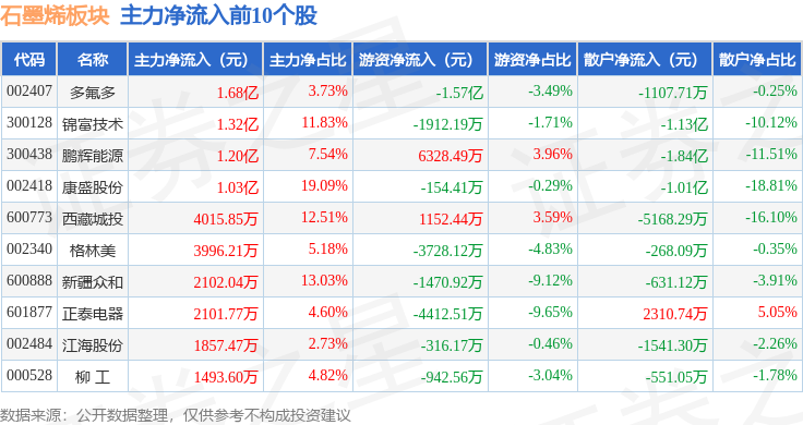 从资金流向上来看,当日石墨烯板块主力资金净流出1.08亿元,游资资金净流出4.21亿元,散户资金净流入5.29亿元。石墨烯板块个股资金流向见下表: