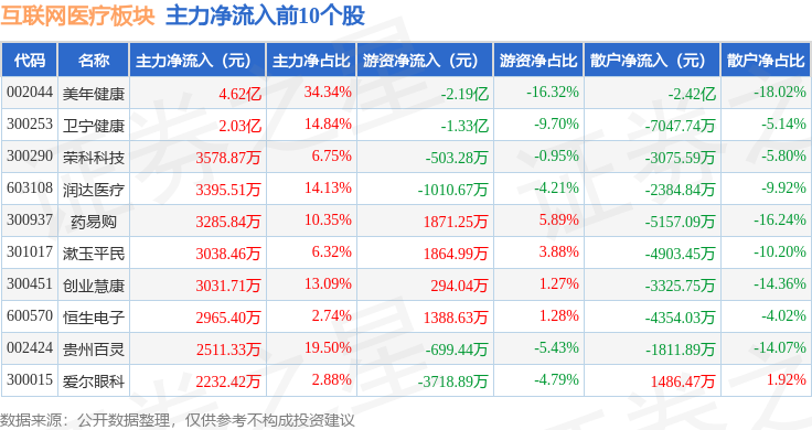 从资金流向上来看,当日互联网医疗板块主力资金净流入3858.53万元,游资资金净流出2.95亿元,散户资金净流入2.56亿元。互联网医疗板块个股资金流向见下表: