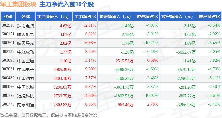 从资金流向上来看,当日军工集团板块主力资金净流出42.6亿元,游资资金净流出3.42亿元,散户资金净流入46.02亿元。军工集团板块个股资金流向见下表: