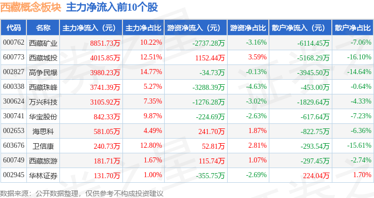 从资金流向上来看,当日西藏概念板块主力资金净流入1.41亿元,游资资金净流出1.27亿元,散户资金净流出1436.0万元。西藏概念板块个股资金流向见下表: