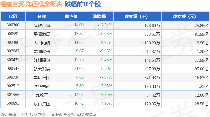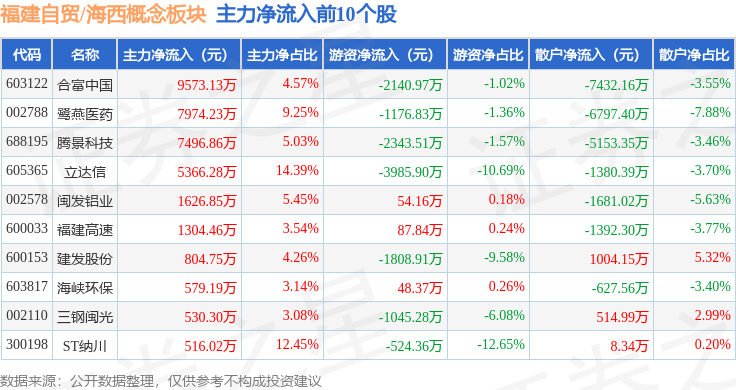 从资金流向上来看,当日福建自贸/海西概念板块主力资金净流出48.24亿元,游资资金净流出4.84亿元,散户资金净流入53.08亿元。福建自贸/海西概念板块个股资金流向见下表: