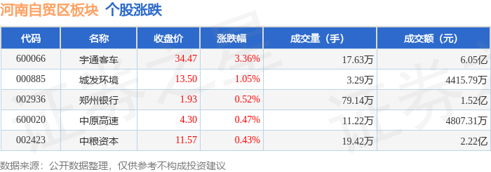 证券之星消息,12月17日河南自贸区板块较上一交易日上涨2.12%,宇通客车领涨。当日上证指数报收于3870.28,上涨1.19%。深证成指报收于13224.51,上涨2.4%。河南自贸区板块个股涨跌见下表: