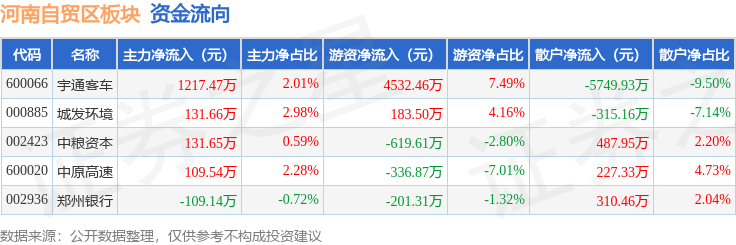 从资金流向上来看,当日河南自贸区板块主力资金净流入1481.18万元,游资资金净流入3558.17万元,散户资金净流出5039.34万元。河南自贸区板块个股资金流向见下表:
