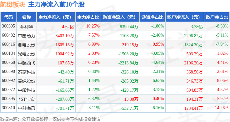 从资金流向上来看,当日航母板块主力资金净流出2.46亿元,游资资金净流出3.63亿元,散户资金净流入6.09亿元。航母板块个股资金流向见下表: