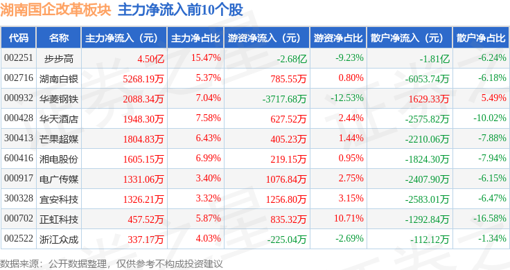 从资金流向上来看,当日湖南国企改革板块主力资金净流入1.37亿元,游资资金净流出2.35亿元,散户资金净流入9748.0万元。湖南国企改革板块个股资金流向见下表: