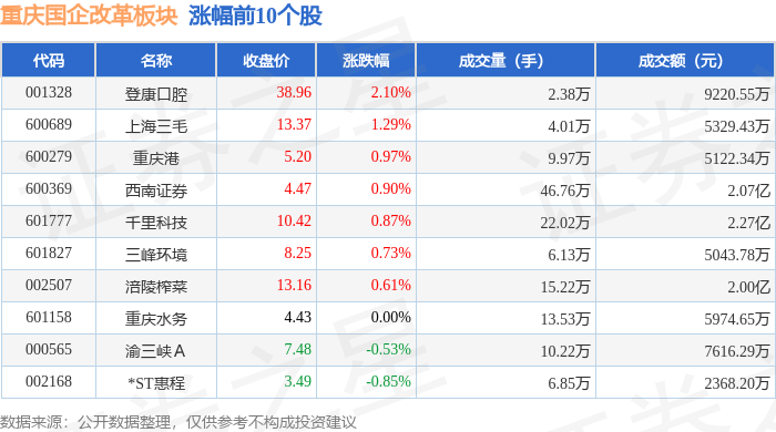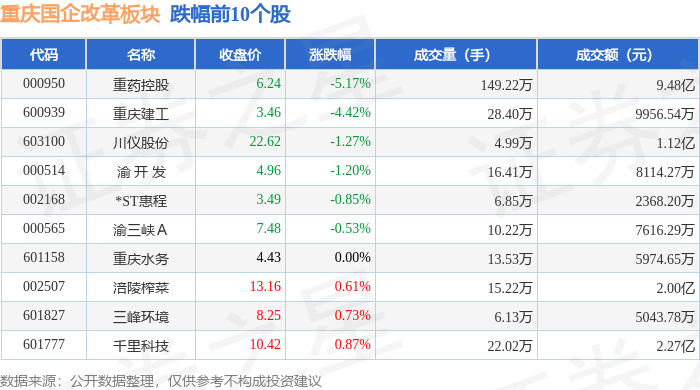 从资金流向上来看,当日重庆国企改革板块主力资金净流出1.02亿元,游资资金净流入3617.66万元,散户资金净流入6619.34万元。重庆国企改革板块个股资金流向见下表: