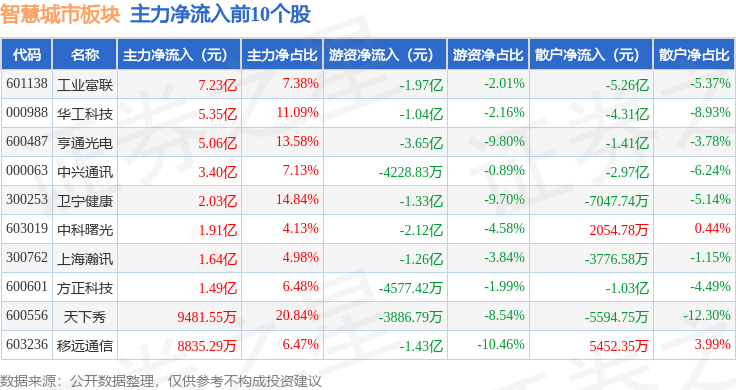 从资金流向上来看,当日智慧城市板块主力资金净流出16.25亿元,游资资金净流出16.85亿元,散户资金净流入33.1亿元。智慧城市板块个股资金流向见下表: