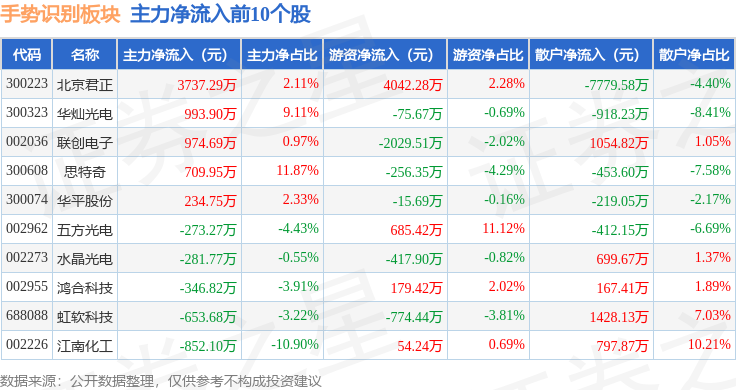 从资金流向上来看,当日手势识别板块主力资金净流出3.24亿元,游资资金净流入5477.91万元,散户资金净流入2.69亿元。手势识别板块个股资金流向见下表: