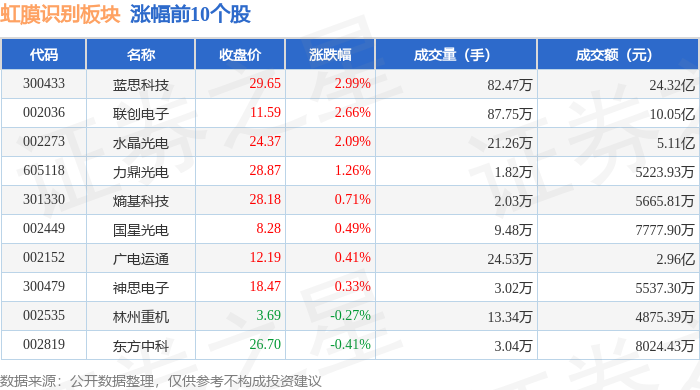 从资金流向上来看,当日虹膜识别板块主力资金净流出1.58亿元,游资资金净流出383.48万元,散户资金净流入1.62亿元。虹膜识别板块个股资金流向见下表: