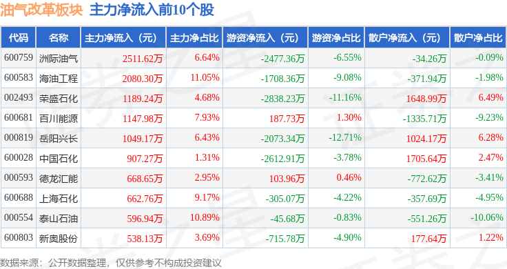 从资金流向上来看,当日油气改革板块主力资金净流出1.83亿元,游资资金净流出1.77亿元,散户资金净流入3.6亿元。油气改革板块个股资金流向见下表: