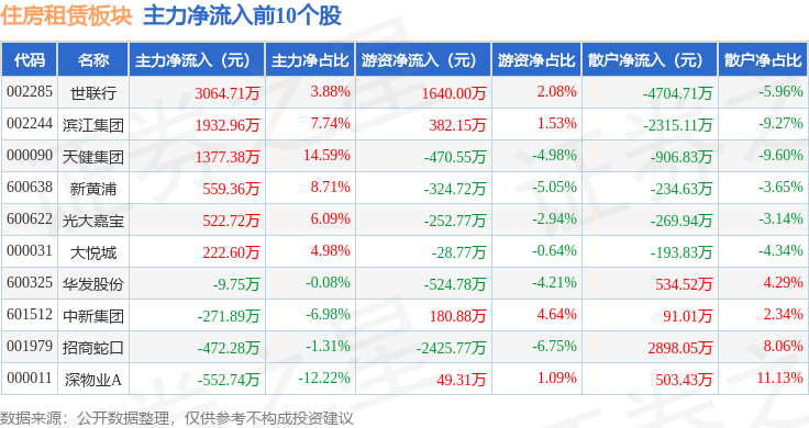 从资金流向上来看,当日住房租赁板块主力资金净流出2.71亿元,游资资金净流出5027.67万元,散户资金净流入3.22亿元。住房租赁板块个股资金流向见下表:
