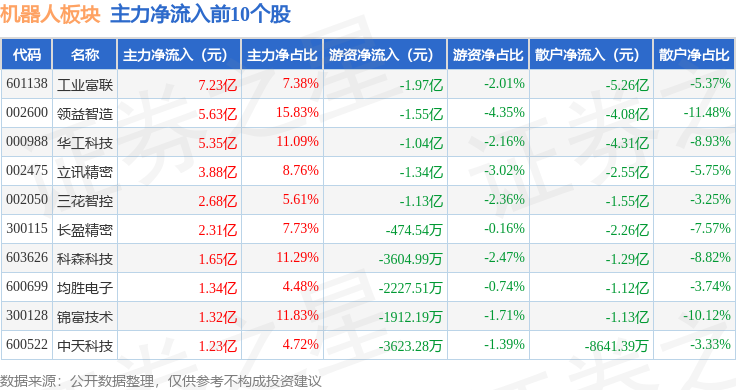 从资金流向上来看,当日机器人板块主力资金净流出7.94亿元,游资资金净流出19.67亿元,散户资金净流入27.61亿元。机器人板块个股资金流向见下表: