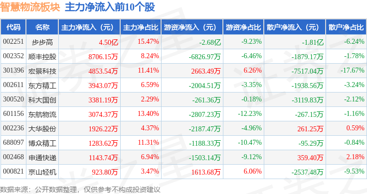 从资金流向上来看,当日智慧物流板块主力资金净流出1.82亿元,游资资金净流出3.09亿元,散户资金净流入4.91亿元。智慧物流板块个股资金流向见下表: