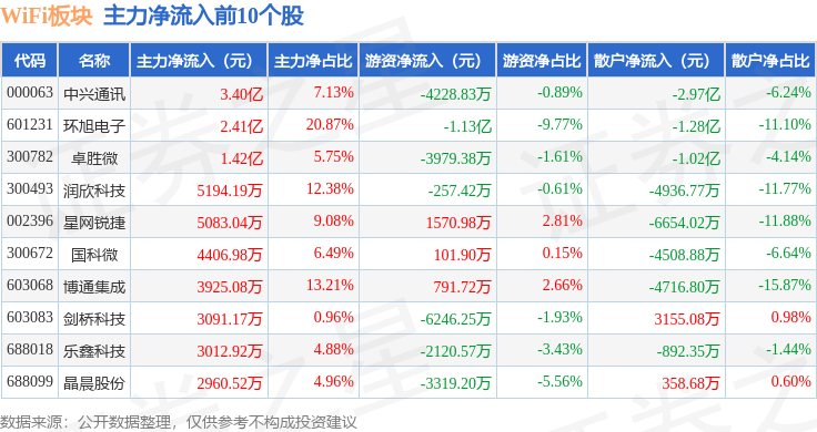 从资金流向上来看,当日WiFi板块主力资金净流出6.2亿元,游资资金净流出1503.55万元,散户资金净流入6.35亿元。WiFi板块个股资金流向见下表: