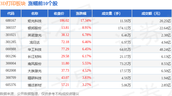 证券之星消息,12月17日3D打印板块较上一交易日上涨1.81%,炬光科技领涨。当日上证指数报收于3870.28,上涨1.19%。深证成指报收于13224.51,上涨2.4%。3D打印板块个股涨跌见下表: