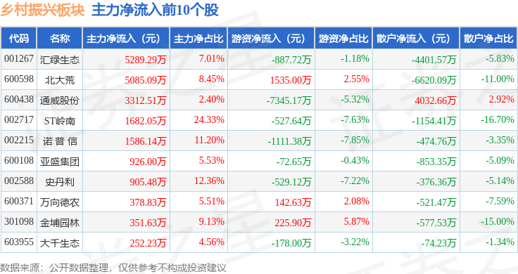 从资金流向上来看,当日乡村振兴板块主力资金净流出3.2亿元,游资资金净流出1.19亿元,散户资金净流入4.39亿元。乡村振兴板块个股资金流向见下表: