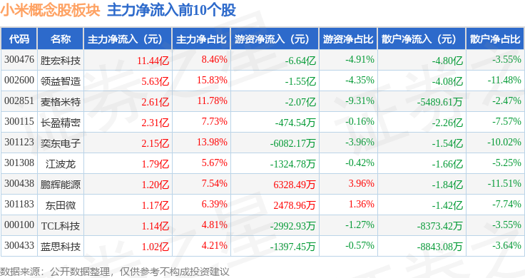 从资金流向上来看,当日小米概念股板块主力资金净流入8.58亿元,游资资金净流出12.96亿元,散户资金净流入4.38亿元。小米概念股板块个股资金流向见下表: