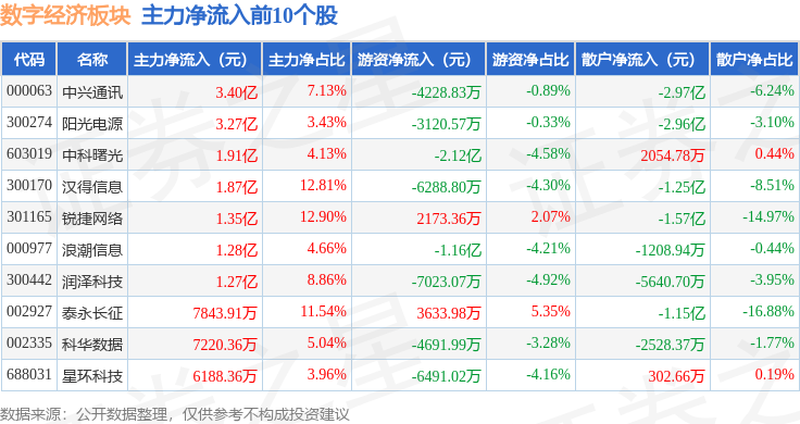 从资金流向上来看,当日数字经济板块主力资金净流出17.68亿元,游资资金净流出8.81亿元,散户资金净流入26.48亿元。数字经济板块个股资金流向见下表: