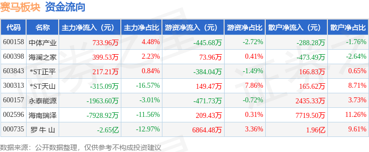 从资金流向上来看,当日赛马板块主力资金净流出3.54亿元,游资资金净流入5995.9万元,散户资金净流入2.94亿元。赛马板块个股资金流向见下表: