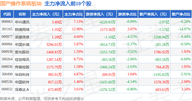 从资金流向上来看,当日国产操作系统板块主力资金净流出5.78亿元,游资资金净流出1.83亿元,散户资金净流入7.61亿元。国产操作系统板块个股资金流向见下表: