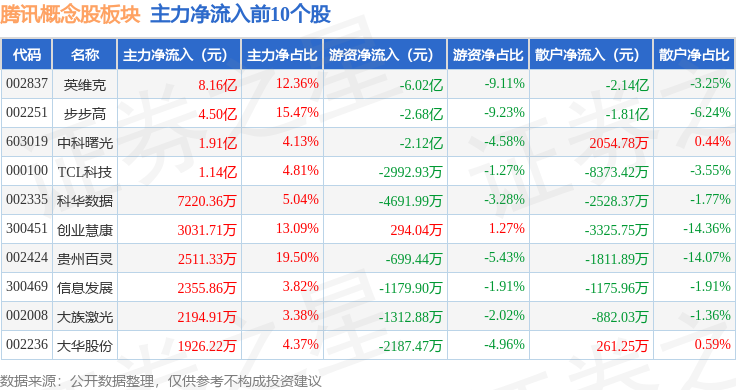 从资金流向上来看,当日腾讯概念股板块主力资金净流出14.58亿元,游资资金净流出5.18亿元,散户资金净流入19.75亿元。腾讯概念股板块个股资金流向见下表: