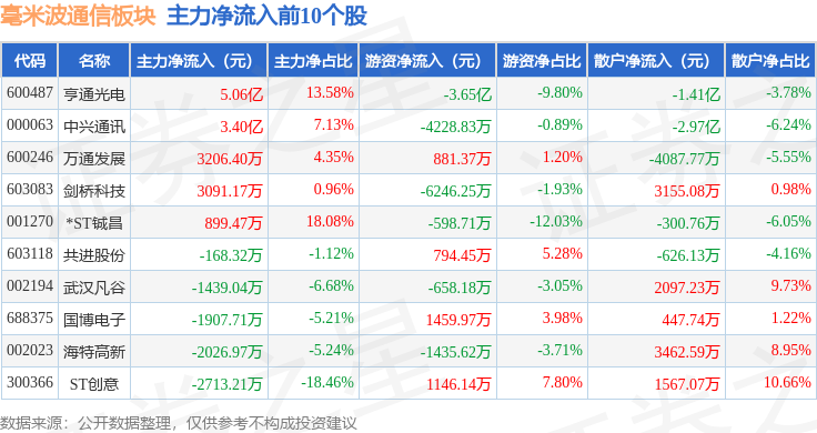 从资金流向上来看,当日毫米波通信板块主力资金净流出10.68亿元,游资资金净流出9406.02万元,散户资金净流入11.62亿元。毫米波通信板块个股资金流向见下表: