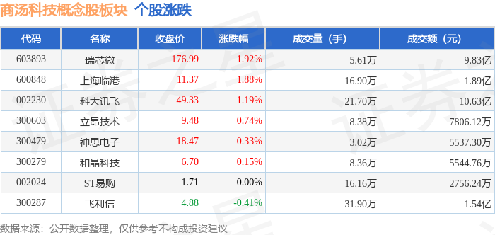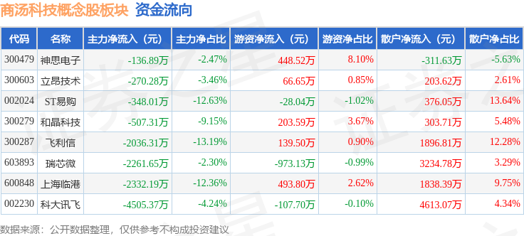 从资金流向上来看,当日商汤科技概念股板块主力资金净流出1.24亿元,游资资金净流入243.2万元,散户资金净流入1.22亿元。商汤科技概念股板块个股资金流向见下表:
