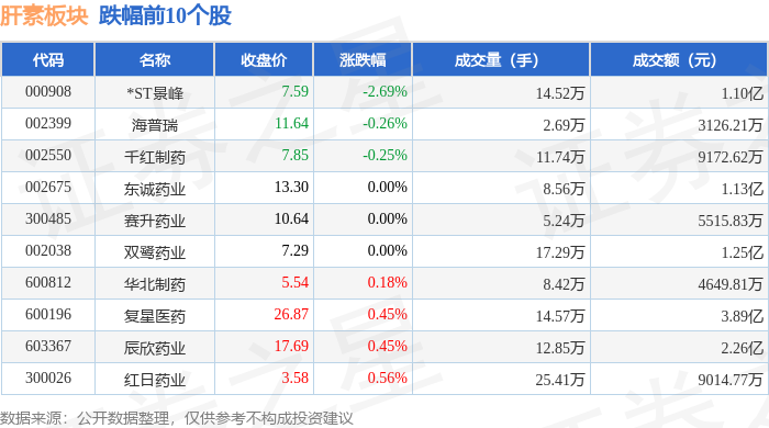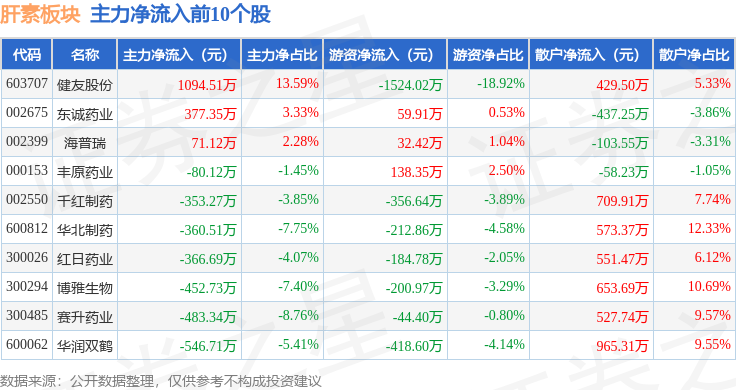 从资金流向上来看,当日肝素板块主力资金净流出1.27亿元,游资资金净流出3556.63万元,散户资金净流入1.63亿元。肝素板块个股资金流向见下表: