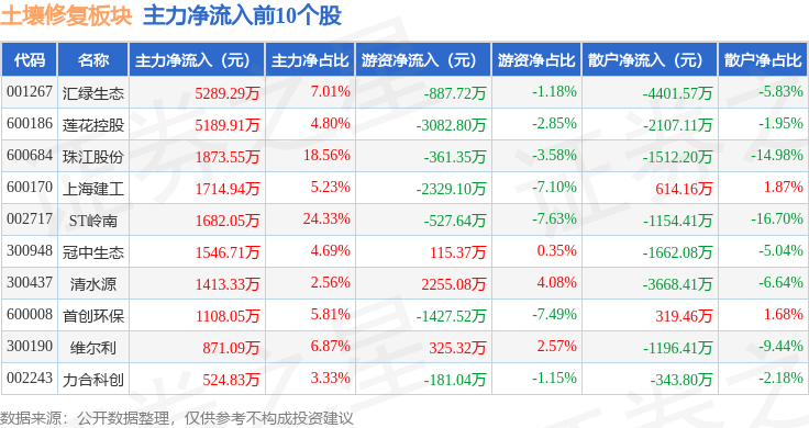 从资金流向上来看,当日土壤修复板块主力资金净流出1.67亿元,游资资金净流出1723.6万元,散户资金净流入1.85亿元。土壤修复板块个股资金流向见下表: