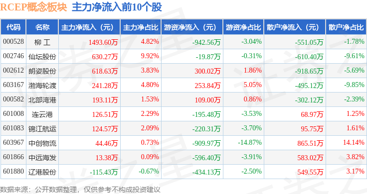 从资金流向上来看,当日RCEP概念板块主力资金净流出1.35亿元,游资资金净流入4619.57万元,散户资金净流入8908.92万元。RCEP概念板块个股资金流向见下表: