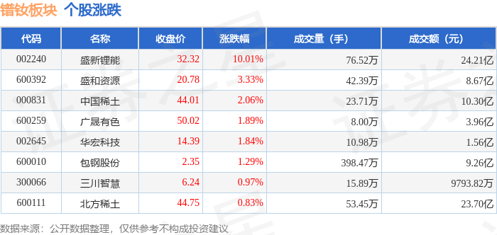 证券之星消息,12月17日镨钕板块较上一交易日上涨2.04%,盛新锂能领涨。当日上证指数报收于3870.28,上涨1.19%。深证成指报收于13224.51,上涨2.4%。镨钕板块个股涨跌见下表: