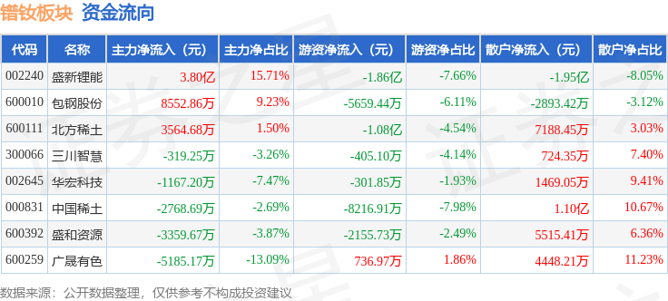 从资金流向上来看,当日镨钕板块主力资金净流入3.74亿元,游资资金净流出4.53亿元,散户资金净流入7948.46万元。镨钕板块个股资金流向见下表: