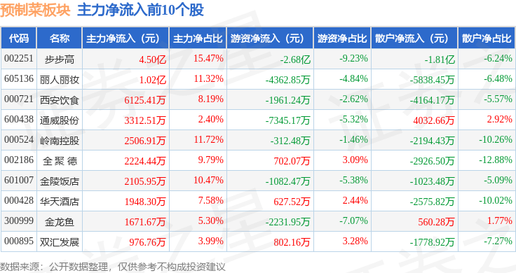 从资金流向上来看,当日预制菜板块主力资金净流入4.69亿元,游资资金净流出4.95亿元,散户资金净流入2625.68万元。预制菜板块个股资金流向见下表: