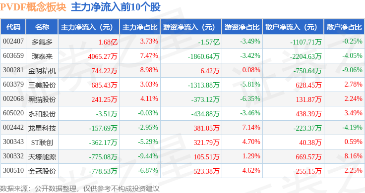 从资金流向上来看,当日PVDF概念板块主力资金净流出2857.32万元,游资资金净流出1.23亿元,散户资金净流入1.51亿元。PVDF概念板块个股资金流向见下表: